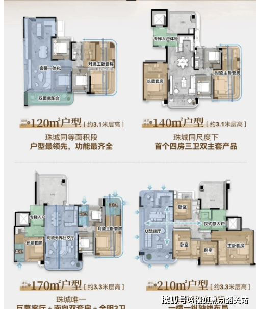 :加推 90 平三房(北地块 B1 栋,2 梯 4 户),在售 120-220㎡四房(南地块板楼,2 梯 2 户),阳台占比达 25%,公共开放空间不计容面积 10%,使用率处于全市豪宅第一梯队;